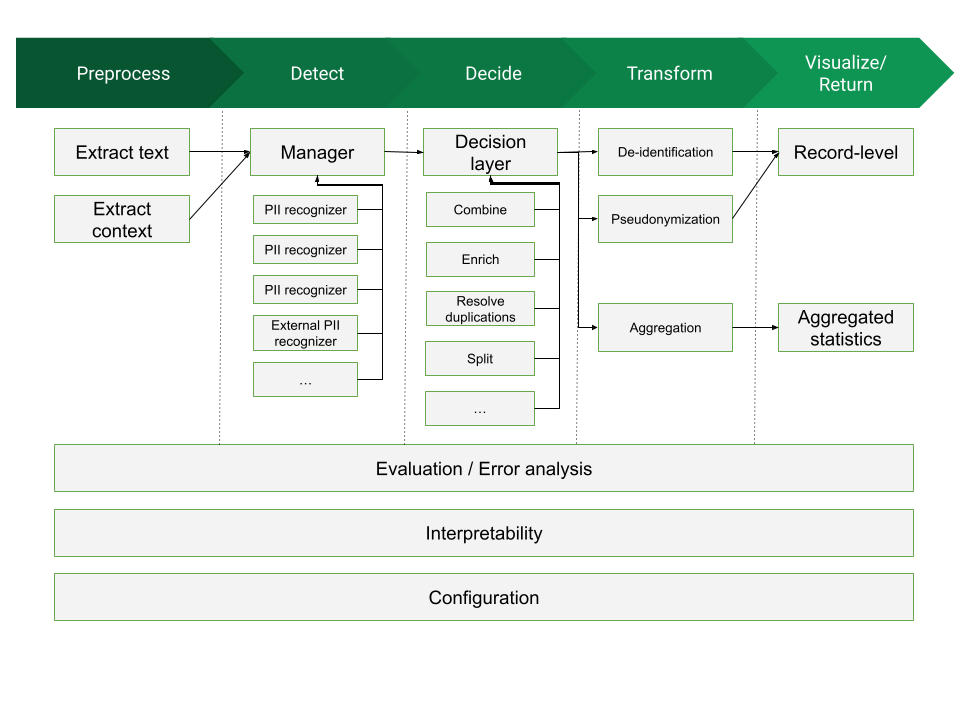 We describe below our proposal for a general PII management framework with a caveat that this continues to be a work-in-progress which will need community input and support. The structure of this framework consists of five major blocks: 1)Preprocess, 2)Detect, 3)Decide, 4)Transform, and 5)Visualize & Return. These blocks are implemented modularly and independently, providing two types of API endpoints: